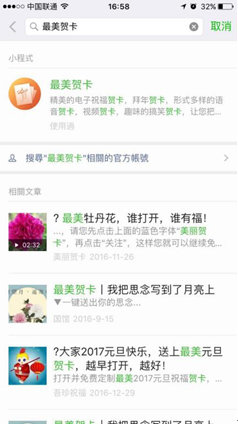 为了让拜年变得简单而有创造性,进入“最美贺卡”小程序的方法也非常简单,第一次使用时,只需要在微信搜索页面中输入“最美贺卡”即可找到。