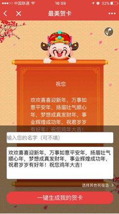 “新春”对人们来说是一个一切都是崭新的代名词,怀抱着所有新的希望从此时出发去迎接一个更加美好的明天,新春到来,你准备好怎样送上你的新年祝福了吗?2017最潮拜年方式,赶紧拿起手机,“最美贺卡”微信小程序,get起来吧!