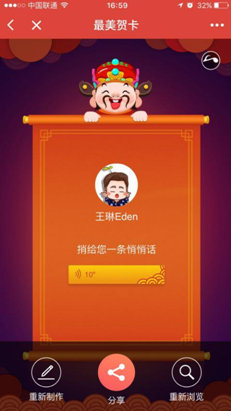 通过猎豹移动“最美贺卡”小程序,把你想说的话录入到一张特别的新年电子贺卡当中,新年的第一天就能让身边的亲人朋友等等听到你的声音,让他们知道新的一年你依然陪在他们身边,融融暖意也会随之升起。