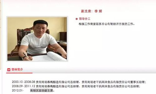 贵阳市南明区政府网站信息显示,从2008年至2011年,李辉历任贵阳南明春梅酿造有限公司总经理、南明老干妈公司董事长助理、贵阳南明老干妈公司总经理;2012年1月起,李辉担任南明区政协副主席,分工为根据工作需要联系非公有制经济方面的工作。