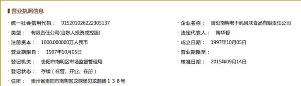 公司秘闻(ID:high3c)发现,南明老干妈注册成立于1997年10月,注册资本1000万元。成立之初,公司由陶华碧全资出资成立。