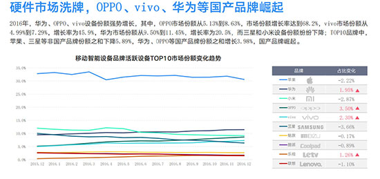 在设备方面,国产品牌的比例达到62.4%,较2015年底增长6.5%,消费者对国产品牌接受度提高。数据显示,2016年,华为、OPPO、vivo设备份额强势增长,其中,OPPO市场份额从5.13%到8.63%,市场份额增长率达到68.2%,vivo市场份额从4.99%到7.29%,增长率为45.9%,华为市场份额从9.50%到11.45%,增长率为20.5%,而三星和小米设备份额纷纷下降;TOP10品牌中,苹果、三星等非国产品牌份额之和下降5.89%,华为、OPPO等国产品牌份额之和增长3.98%。