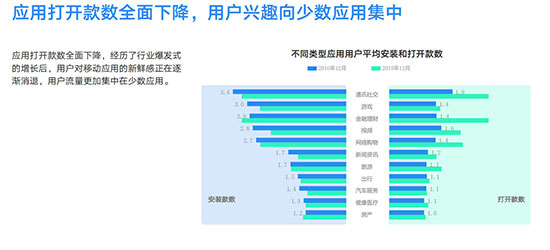 应用打开款数全面下降,经历了行业爆发式 不同类型应用用户平均安装和打开款数的增长后,用户对移动应用的新鲜感正在逐渐消退,用户流量更加集中在少数应用。