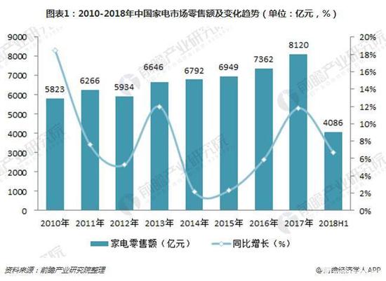 数据显示,2018年上半年家电行业整体增速明显放缓,零售额4088亿元 同比增长6.7%。零售而同比涨幅超过10%的品类有冷柜13.1%、空调15.5%、洗碗机38.2%、净水器19.6%、吸尘器29.5%。