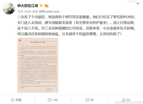 针对该事件,果壳网科普作者钟凯博士在微博中表示“三全发了个内部信,我觉得有个细节其实很重要。他们已经买了罗氏的PCR仪,专门送人去培训,建专用配套实验室(有生物安全防护要求)。加上日常运维,这个投入不低。对三全这种规模的公司来说,还能承受,小企业根本玩不起啊。所以重点还是前端检验检疫,让末端来干防疫的事情,太劳民伤财了!”