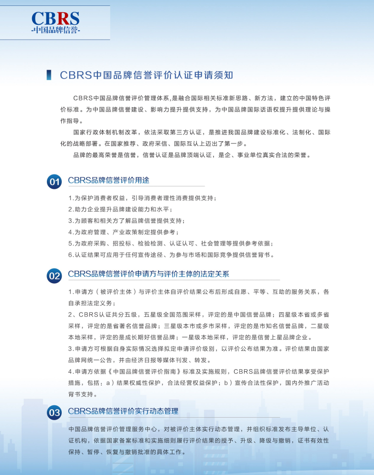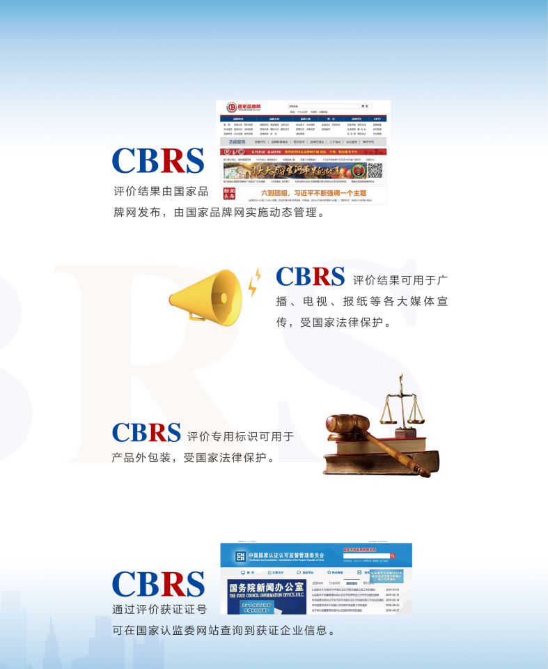 CBRS《中国品牌信誉评价指南》标准,是企业和产品质量管理、销售管理、舆情管理的顶端认证;是企业、产品品牌的最高荣誉!