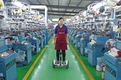 ▲2019年10月23日,在诸暨市大唐街道一家制袜企业的智能生产车间,工人驾驶平衡车查看袜机生产情况。
