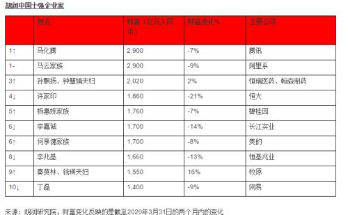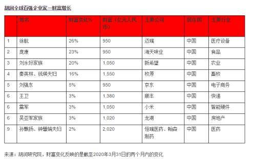 全球百强企业家中只有9人的财富在过去两个月里有所增长,包括迈瑞医疗的徐航、海天味业的庞康、新希望的刘永好等。马化腾首次与马云并列成为中国首富,财富均为2900亿元。