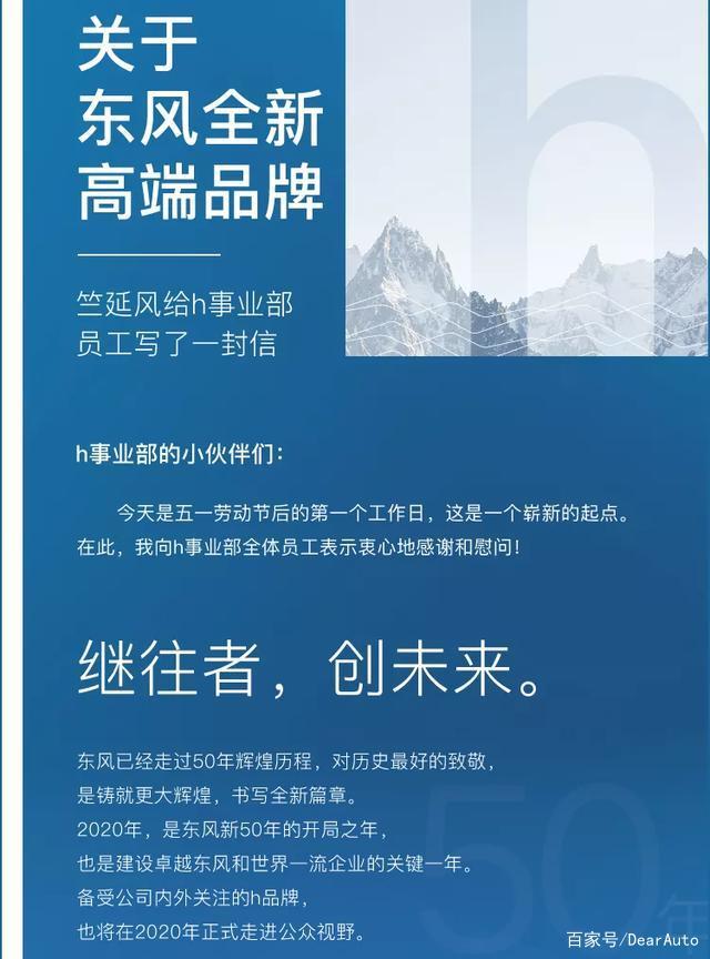 5月6日竺延风给h事业部员工写了一封信,信中称h品牌将拥有全新的组织、机制和商业模式,要成为中国新能源汽车产业引领者。东风原计划在今年北京车展上举行品牌发布会,但因疫情被迫延迟,竺延风特意在5月6日写信给h事业部员工,或预示全新品牌亮相之日已近在眼前。