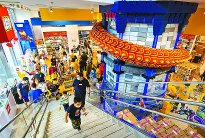 记者探访乐高人民广场旗舰店时,发现它所在的上海世贸广场在户外打造了一个以蓝精灵为主题的体验展,模拟蓝精灵村庄。很多孩子在蓝精灵的魔法小屋、热气球、蘑菇树之间奔跑,长辈们忙着给他们拍照。距离蓝精灵体验展不远,是另一家在上海小有名气的消费体验馆“m豆巧克力世界”。门店里,巧克力豆和衍生品色彩斑斓,除了包装好的成品,消费者还可以从一桶桶巨大的不同口味、不同颜色的巧克力豆中搭配自己喜欢的组合。在这家店铺旁边,有一个专属电梯,标注着前往“Hello Kitty上海滩时光之旅”,里面同样是体验项目。据记者观察,很多带着孩子的消费者不愿错过任何一家体验店,依次打卡,还顺便逛逛商场的其余店铺,整个商场人气不低。