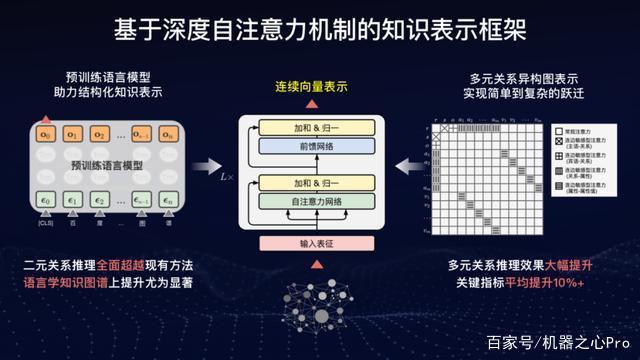 最近,这个知识图谱也有了全新升级。在通用图谱方面,百度提出了基于深度自注意力机制的知识表示框架,通过深度自注意力网络对知识图谱中的实体和关系进行连续向量表示,在此基础上,进一步引入预训练语言模型助力结构化知识表示,二元关系推理能力全面超越现有方法,语言学知识图谱上提升尤为显著。