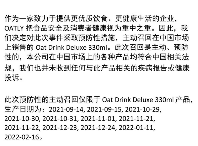 OATLY发布的中国市场产品召回公告。资料图片