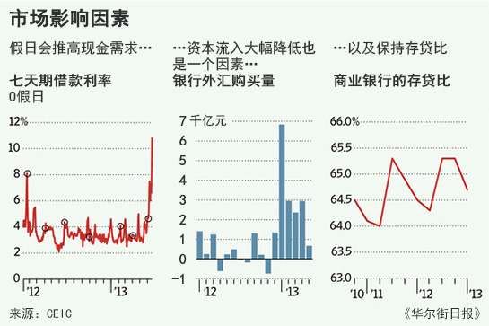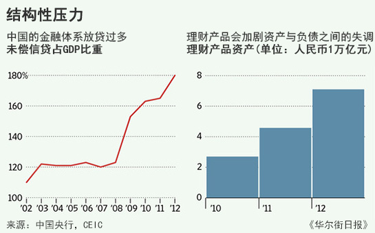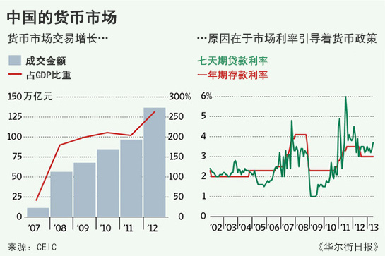 症结之一就是过度膨胀的金融体系。中国信贷与占国内生产总值(GDP)的比重2012年达到180%,高于2008年的123%。随着中国经济增长不断放缓,增加的这部分贷款很可能最终成为坏账。这迫使银行更主动地向货币市场寻找资金来应付日常业务。