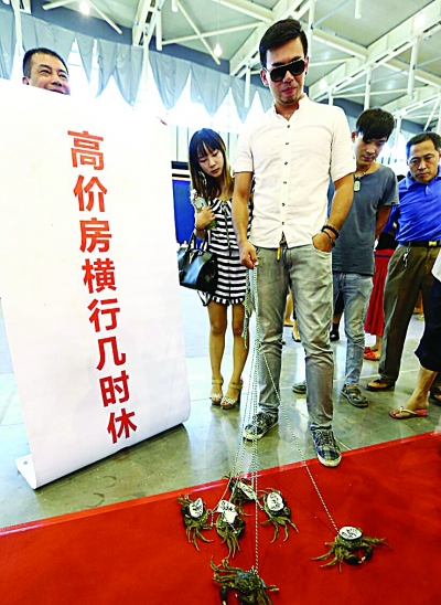 在南京,一位小伙用绳子牵着几只螃蟹现身展会,螃蟹壳上贴有“高地价”“高房价”字样,寓意高房价和高地价“横行”。“遛蟹哥”说,他的目的是控诉高房价,南京房价一涨再涨,年轻人在主城买房已遥不可及。