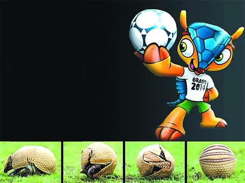 从里约热内卢的机场出来,可以看见一只巨大的巴西世界杯吉祥物,美洲的哺乳动物犰狳,在碰到危险的时候会把身体卷成球状。它的官方名字叫“Fuleco(福来哥)”,产自中国杭州。