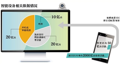 分析机构IDC预测,到2020年将有2000亿台智能设备,连接至互联网,而现在约有50亿台设备。其中包括约10亿台电脑、20亿个手机或平板电脑以及20亿个如温度监控、网络摄像机等设备。