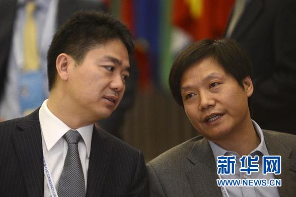 11月18日,京东集团首席执行官刘强东(左)与小米科技首席执行官雷军在世界互联网大会开幕式上交流。