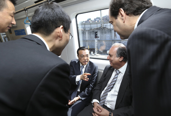 (李克强总理参观里约地铁公司,乘坐中国北车制造的里约奥运地铁支线4号线列车。)