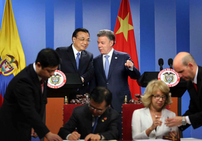 李克强此访在哥前后停留仅23小时,期间双方要举行大、小范围会谈和签字仪式等活动,行程紧凑。在两国领导人的共同见证下,两国代表一口气签了12份协议,涵盖产能合作、金融、贸易、投资等多个领域。桑托斯总统说哥伦比亚对中国永远心存感激,将继续与中国在双边和多边领域进行更广泛的合作。