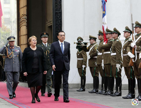 (克强总理与巴切莱特总统一起检阅总统府卫队)