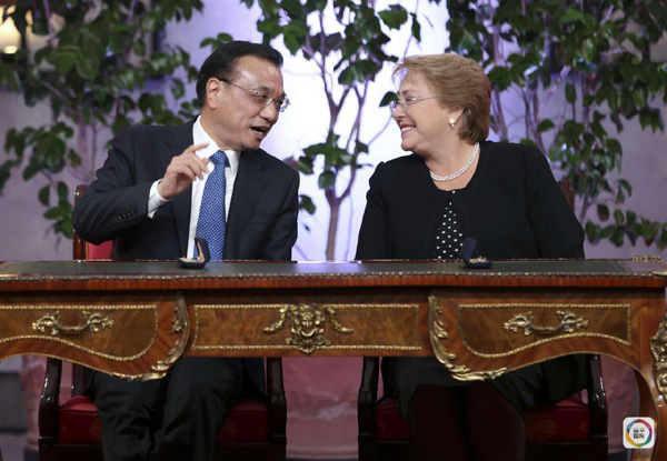 李克强总理的访问,为中智两国增添了两个“第一”。李克强与巴切莱特共同会见记者时透露,中智两国将签署本币互换协议,并将在智利建设拉美第一家人民币清算行。同时,智利也将成为拉美地区第一个获得500亿人民币合格境外机构投资者(RQFII)额度的国家。双方共同发表中智政府联合声明,两国领导人还见证了中智政府共同行动计划以及双边经贸、产能、基础设施、金融、农业、矿产、文化、科技、司法等领域合作文件的签署。