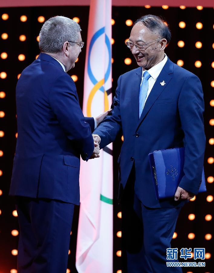 7月31日,国际奥委会主席巴赫(左)与进场准备陈述的中国奥委会主席、国家体育总局局长刘鹏握手。当日,在国际奥委会第128次全会上,2022年冬奥会候选城市进行陈述。 新华社记者王丽莉摄