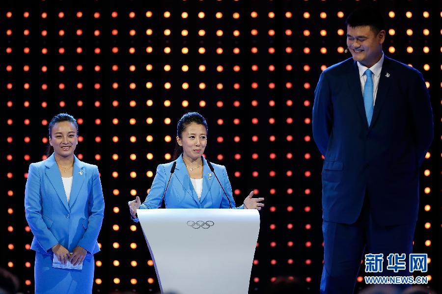 7月31日,国际奥委会委员、冬奥会短道速滑冠军杨扬(中)和北京2022形象大使、自由式滑雪空中技巧世界冠军李妮娜(左)、北京2022形象大使、著名篮球运动员姚明进行陈述。当日,在国际奥委会第128次全会上,2022年冬奥会候选城市进行陈述。 新华社记者王丽莉摄