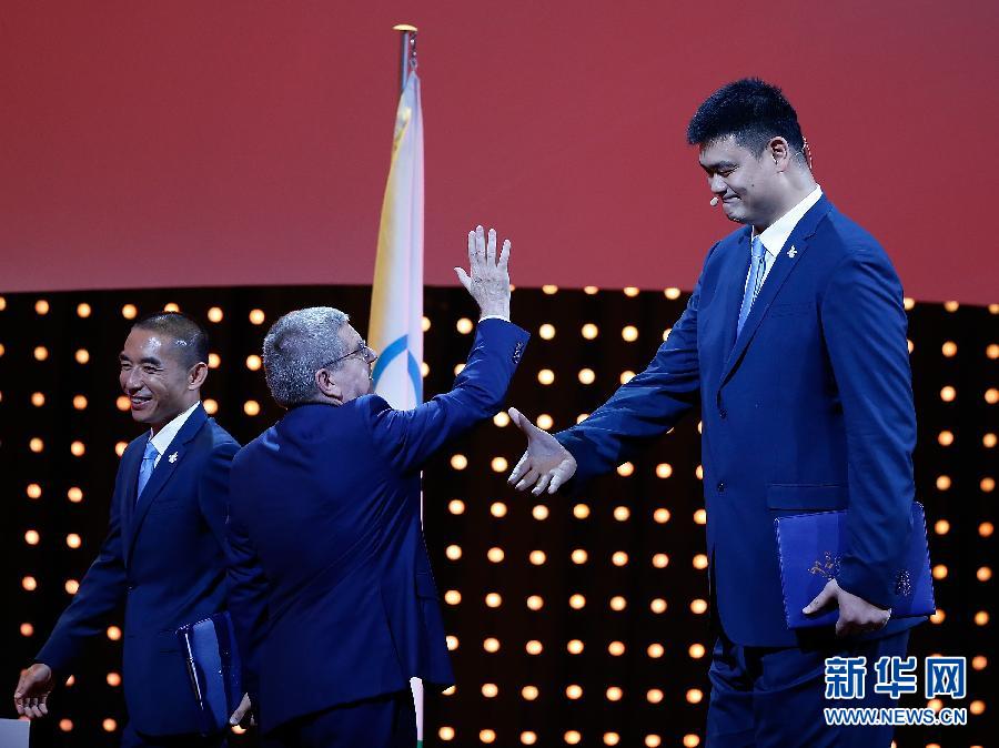 7月31日,国际奥委会主席巴赫(左)与进场准备陈述的北京2022形象大使、著名篮球运动员姚明握手致意。当日,在国际奥委会第128次全会上,2022年冬奥会候选城市进行陈述。 新华社记者王丽莉摄