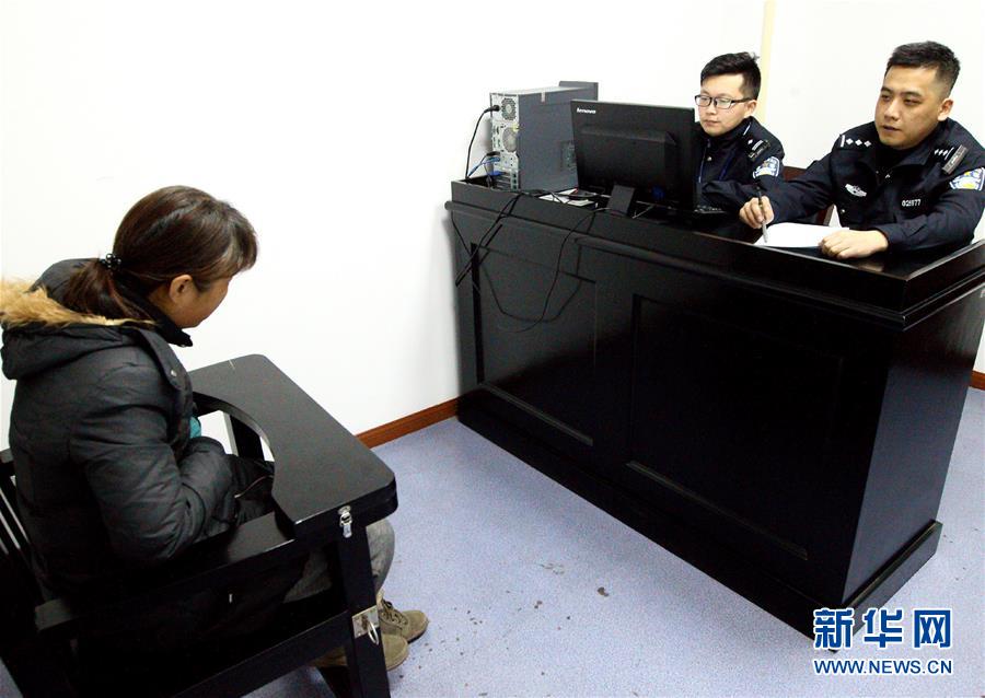 图片说明:上海长宁公安分局民警对一名违反交通规则并涉嫌妨害公务的犯罪嫌疑人进行讯问。(新华社记者 陈飞 摄 )