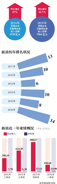 有业内分析人士认为,新浪在视频、直播时代缺乏有力的主动作为,让新浪错失后来的互联网发展风口。多年过去,新浪仍主要依靠广告营收,盈利模式过于单一。新浪财报显示,2016年第一季度净营收为1.987亿美元,比照上年同期增长8%,网络广告营收占净营收比例,仍高达82%。