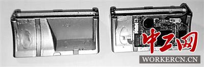 “诚信第一”告诉记者,这就是常被套在ATM插卡口上的“鸭嘴”卡口,并非常“专业”地“科普”说,只要银行卡从这个卡口经过,磁条内的三轨信息都会被记录在采集器内,“贴”在ATM键盘上方的针孔摄像机则用来获取用户密码。“一个采集器一次性可以记录80到100张银行卡的信息,完全够用了。”“诚信第一”说。