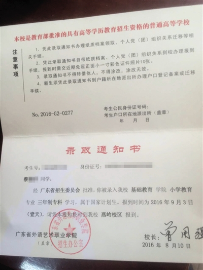 蔡某家属提供的入学通知书中,清晰地写着,录取学校是广东省外语艺术职业学院,蔡某报到时间为9月3日。