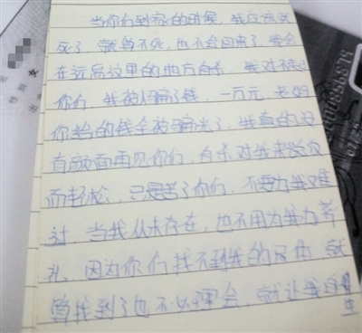 昨天,蔡某表哥张先生向新京报记者出示了蔡的“遗书”,蓝黑交替笔迹的纸上,留下了蔡某的溺亡原因:“我被骗了钱,一万元,老妈你给的钱全被骗光了,我真的没有颜面再见你们。”