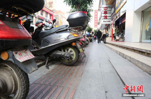 资料图:在广西柳州闹市区周围,多处盲道变成了临时停车场,一些盲道还出现不合理的设计,使盲道变“盲”。李俊锋 摄