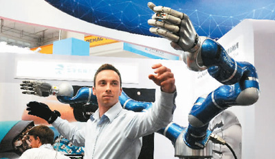 8月24日,北京亦创国际会展中心机器人大会上,一位德国的技术人员在展示机器人。龚文豹摄(人民视觉)