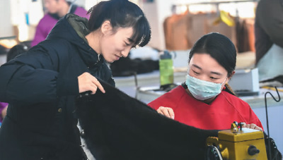 12月8日,河北省枣强县某服装企业工作人员正在工作中。目前,该县年出口裘皮服装服饰300余万件。新华社记者 李晓果摄