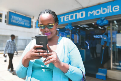5月9日,在肯尼亚首都内罗毕市中心,一名当地用户正在使用中国品牌手机。新华社记者 孙瑞博摄