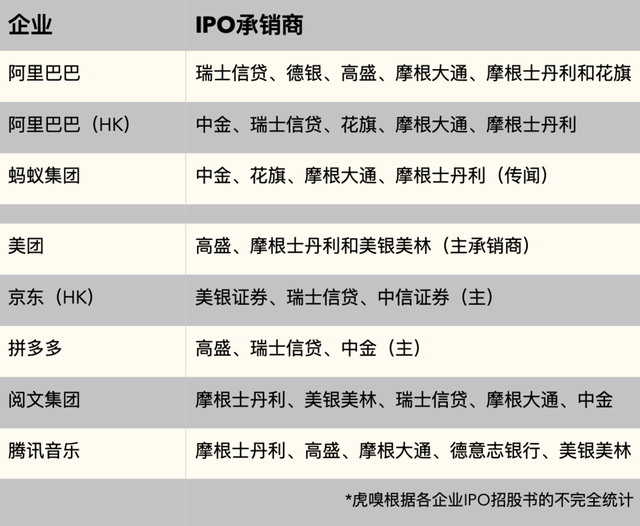 在虎嗅根据各家IPO招股书统计的一份承销商名单(有的是主承销商)中,高盛和美国银行分别是拼多多IPO和京东二次上市的主承销商,二者同时位列美团IPO主承销商。至于为什么一会儿美国银行、一会儿美银美林、一会儿美银证券,主要是因为2019年初,美国银行(Bank of America)宣布其投资银行和交易部门将不再使用美林(Merrill Lynch)的名称,美国银行将这些业务组合成美国银行证券(BofA Securities)部门,其财富管理业务则统称为“美林”(Merrill)。
