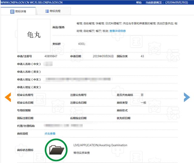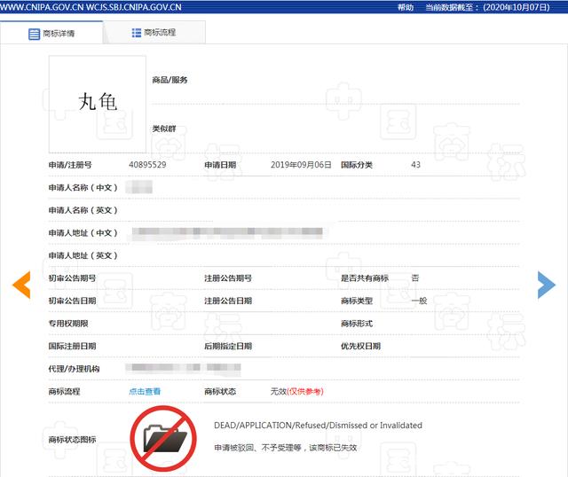 检索中国商标网,2019年9月有人申请注册了两个“龟丸”“丸龟”文字商标,指定使用在第43类上。