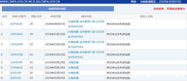 丸龟制面隶属于株式会社东利多公司,先后申请了8件带有“丸龟”字样的商标。