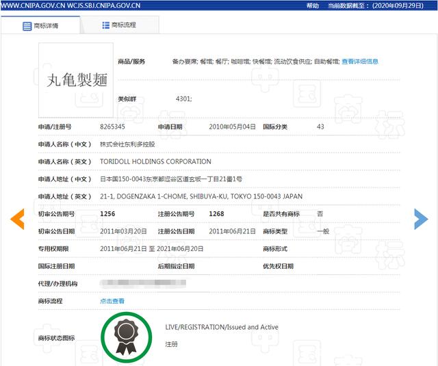 而东利多公司最早在2010年申请了“丸龟制面”商标,且目前已被成功注册在第43类上。