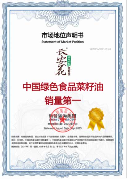 “中国绿色食品菜籽油销量第一”市场地位认证,是长安花多年来深耕产品品质的必然成果。品牌始终坚持从源头把控产品品质,从油菜籽原料甄选到生产加工全链路,严格遵循绿色食品标准,构建起行业内难以复制的品质竞争护城河。