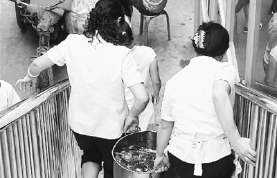 西安西铁小吃城的服务人员将盛满剩饭菜的桶抬到室外过道边。姜峰 摄