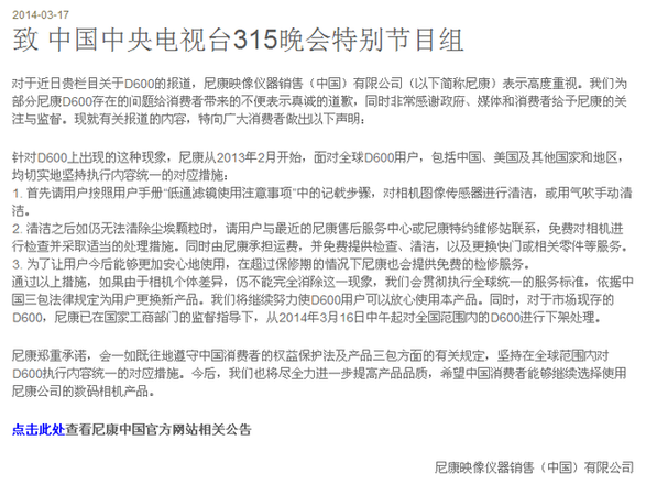对此,3月17日,尼康中国在官网发布道歉:将为D600用户提供免费检查、清洁服务,仍无法解决将免费提供更换快门或零件等。如果由于相机个体差异,仍不能完全消除这一现象,尼康执行全球统一的服务标准,依据中国三包法律规定为用户更换新产品。