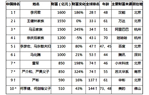在去年下半年上演“首富二人转”的王健林和马云在本次榜单上分列中国内地富豪的二三位。万达商业地产和万达院线短短2个月间分别在香港及内地成功上市,受此影响王健林家族的财富增加至1550亿元人民币,排名内地富豪第二。马云的阿里巴巴去年成功在美上市,使得马云的身家暴涨3.5倍,达到1500亿元,排名内地富豪第三位。