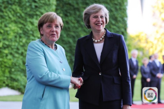 7月20日,在德国柏林,德国总理默克尔(左)与英国首相特雷莎·梅在欢迎仪式上握手。 (新华社记者郭洋摄)