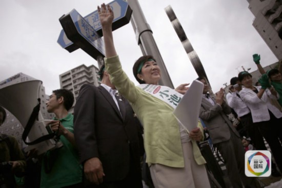 7月31日,在日本东京,小池百合子(中)庆祝当选东京都知事。 ( 新华社/法新)