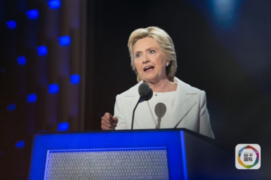 7月28日,在美国宾夕法尼亚州费城举行的民主党全国代表大会上,民主党总统候选人希拉里·克林顿发表演讲。 (新华社记者李木子摄)