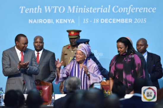 2015年12月16日,在肯尼亚内罗毕,利比里亚总统埃伦·约翰逊-瑟利夫(中)在一场会议上向与会者致意。(新华社记者孙瑞博摄)