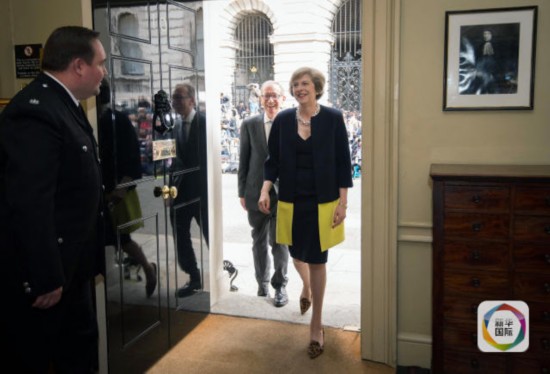 7月13日,在英国伦敦,英国新首相特雷莎·梅(右)与丈夫菲利普·约翰·梅走入唐宁街10号首相府。 (新华社/美联)
